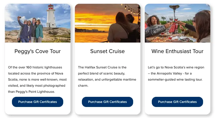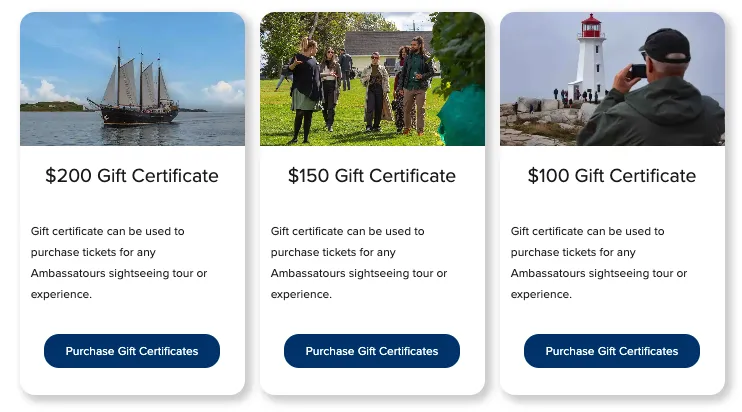 2. The value of an Ambassatours Gift Certificates can be used towards ANY of our tours. For example, if you receive/gift a Tall Ship Silva Cruise, the value of the gift certificate can be instead used towards a Harbour Hopper Tour. Please note: if there is a difference in price between the tours, you will have to pay the difference if the gift certificate does not cover it.
